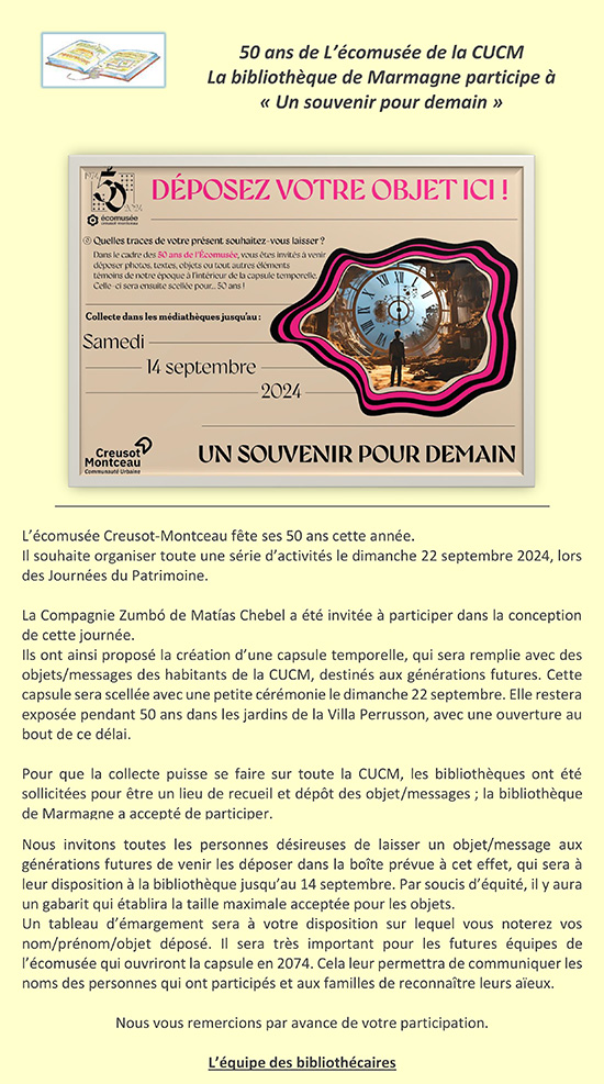 "50 ans de l'écomusée de la CUCM ". La bibliothèque participe à la collecte de messages/objets pour la création d'une capsule temporelle