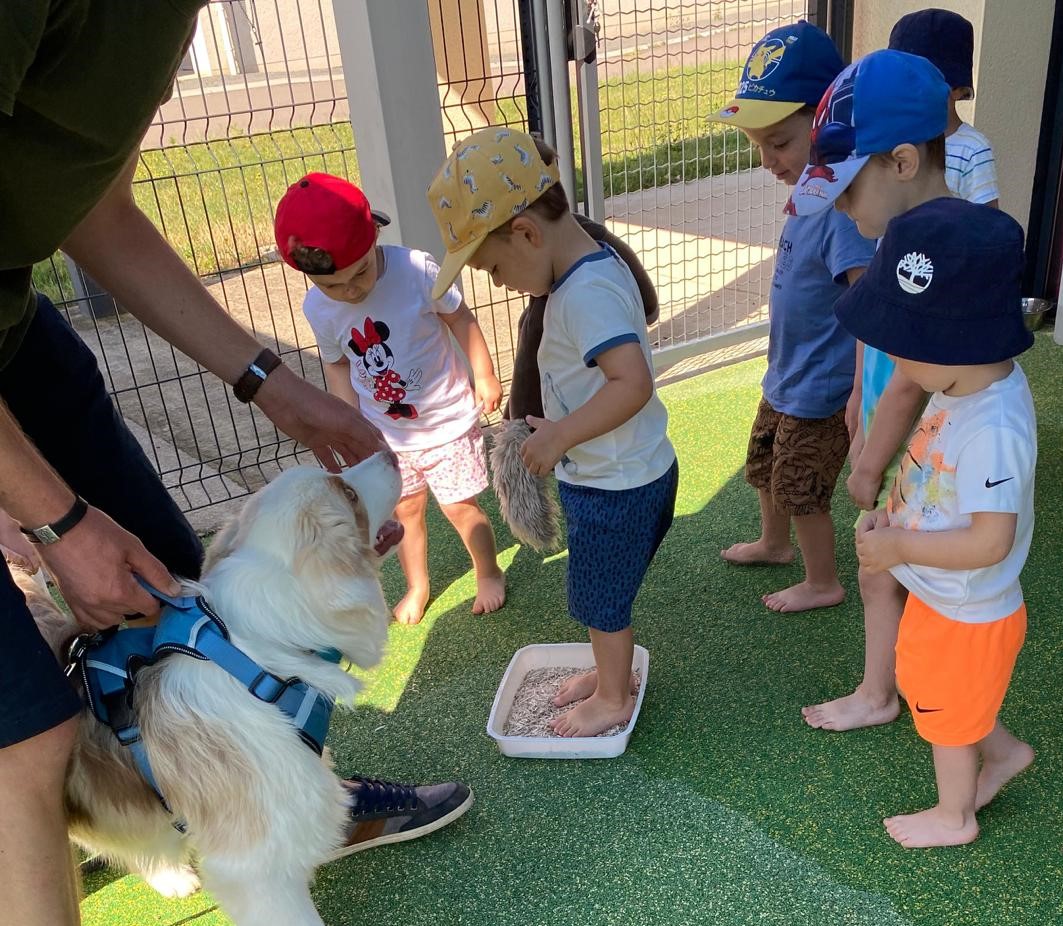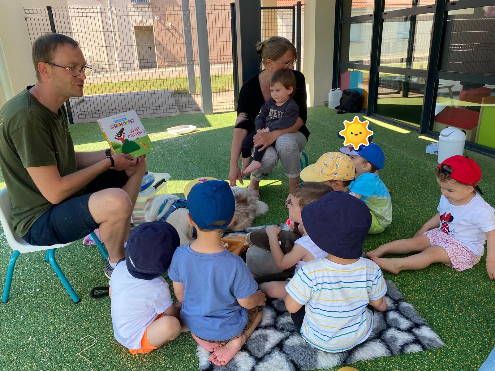 Les enfants de la micro-crèche ont reçu la visite de Julien d’Anim’maux accompagné de son chien Tornade et de la peluche P’tit Loup, bien connue des enfants. Julien a proposé aux enfants un parcours sensoriel avec Tornade en chef de file, un atelier « Petits vétérinaires en herbe », la lecture des aventures de P’tit Loup, et les enfants ont aussi pu prendre soin de Tornade en la brossant. Cette intervention offre aux enfants des découvertes sensorielles et émotionnelles qui stimulent la communication, l’ouverture aux animaux, la gestion des émotions, les soins des animaux, etc… Cette matinée en compagnie de Julien , Tornade et P’tit Loup a été un agréable moment de partage et de bienveillance.