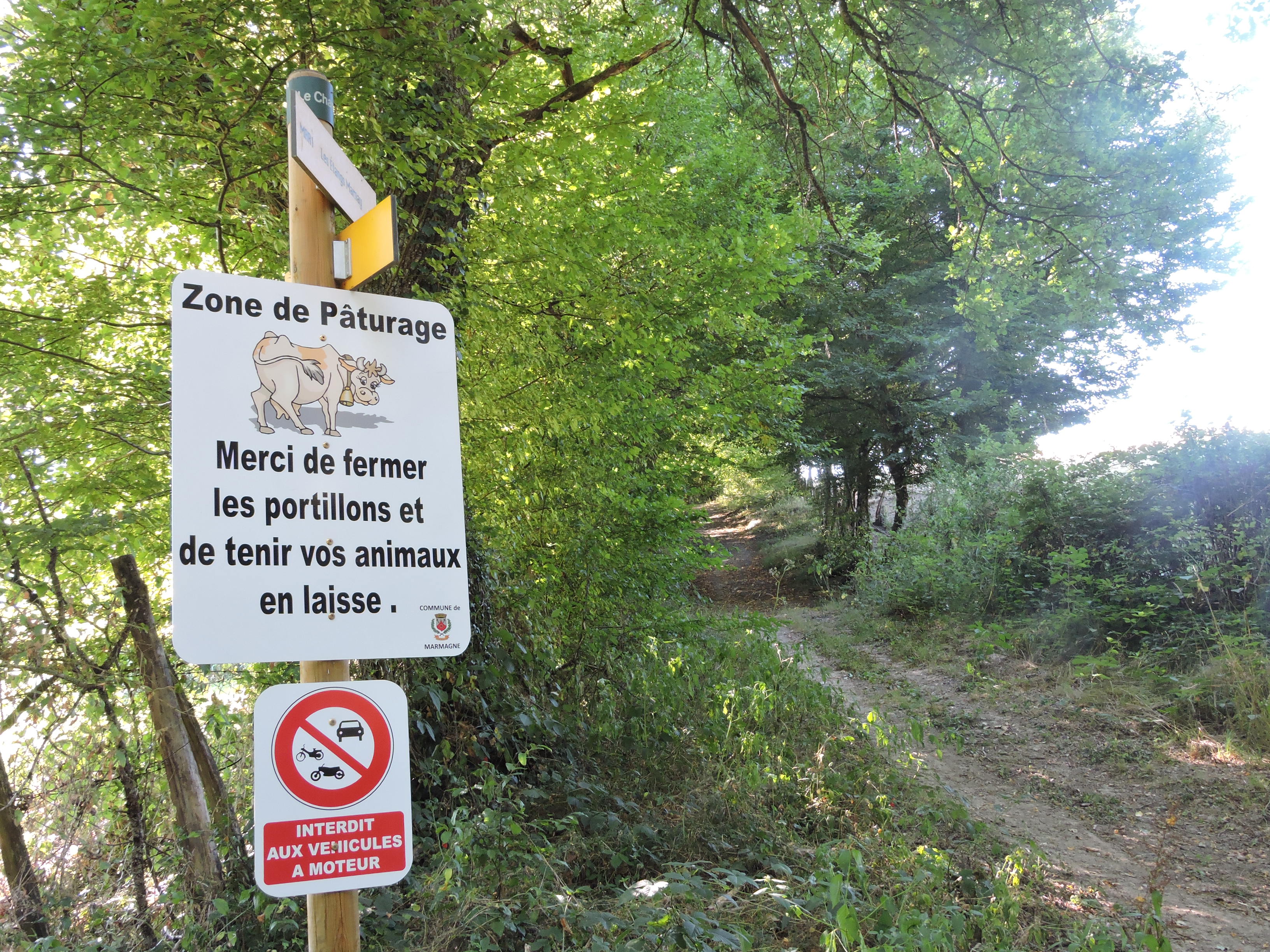La commune vient d'installer de nouveaux panneaux sur la balade verte référencée MAR1 Le Bois des Vignes . Ils ont été placés au Chambon après la passerelle du Mesvrin dans le sens de la montée et aux étangs Marnay dans le sens de la descente. Dès la mise en service de la balade verte en mai 2021,sur cette partie entre le Chambon et les étangs Marnay plusieurs portillons ont été installés pour assurer le passage des marcheurs tout en permettant aux vaches de changer librement de prés de part en part du chemin. L'un des panneaux précise l'interdiction d'accès à tous les véhicules à moteur, et le second annonce la zone de pâturage et incite les randonneurs ou utilisateurs du chemin à bien s'assurer de la fermeture des portillons après leur passage, ainsi qu'à tenir leurs animaux en laisse. La boucle complète de 8,3 km au départ de la place de l'église, passe à St Symphorien de Marmagne après avoir emprunté le chemin de la Tour, ensuite en face de la mairie bifurquer à gauche rue des sources, puis après avoir suivi le chemin de terre en côte présentant 210m de dénivelé on atteint les étangs Marnay avant de redescendre à Marmagne par le Bois des vignes. Bien sûr la boucle peut se faire dans l'autre sens. De difficulté moyenne la durée estimée est de 2h 10. La fiche détaillée est disponible en mairie ou consultable sur le site internet de la commune rubrique vie pratique puis balades vertes.