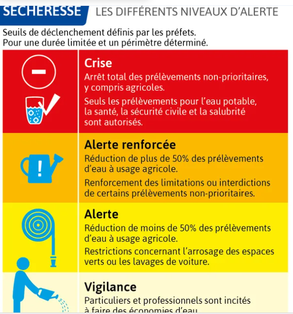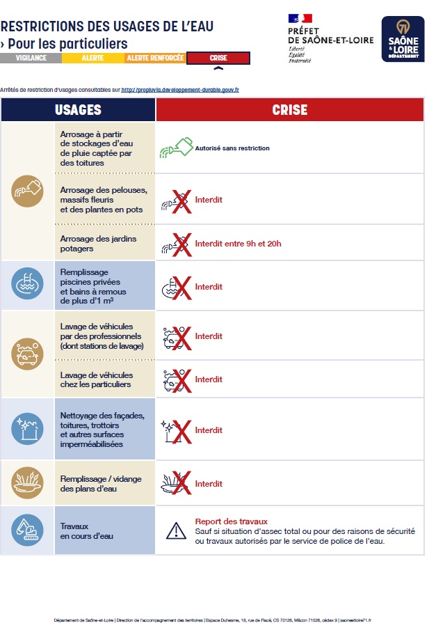 En date du 07/09, l'arrêté sur les restrictions de l'usage de l'eau a été renforcé par le préfet au vue du déficit en eau.