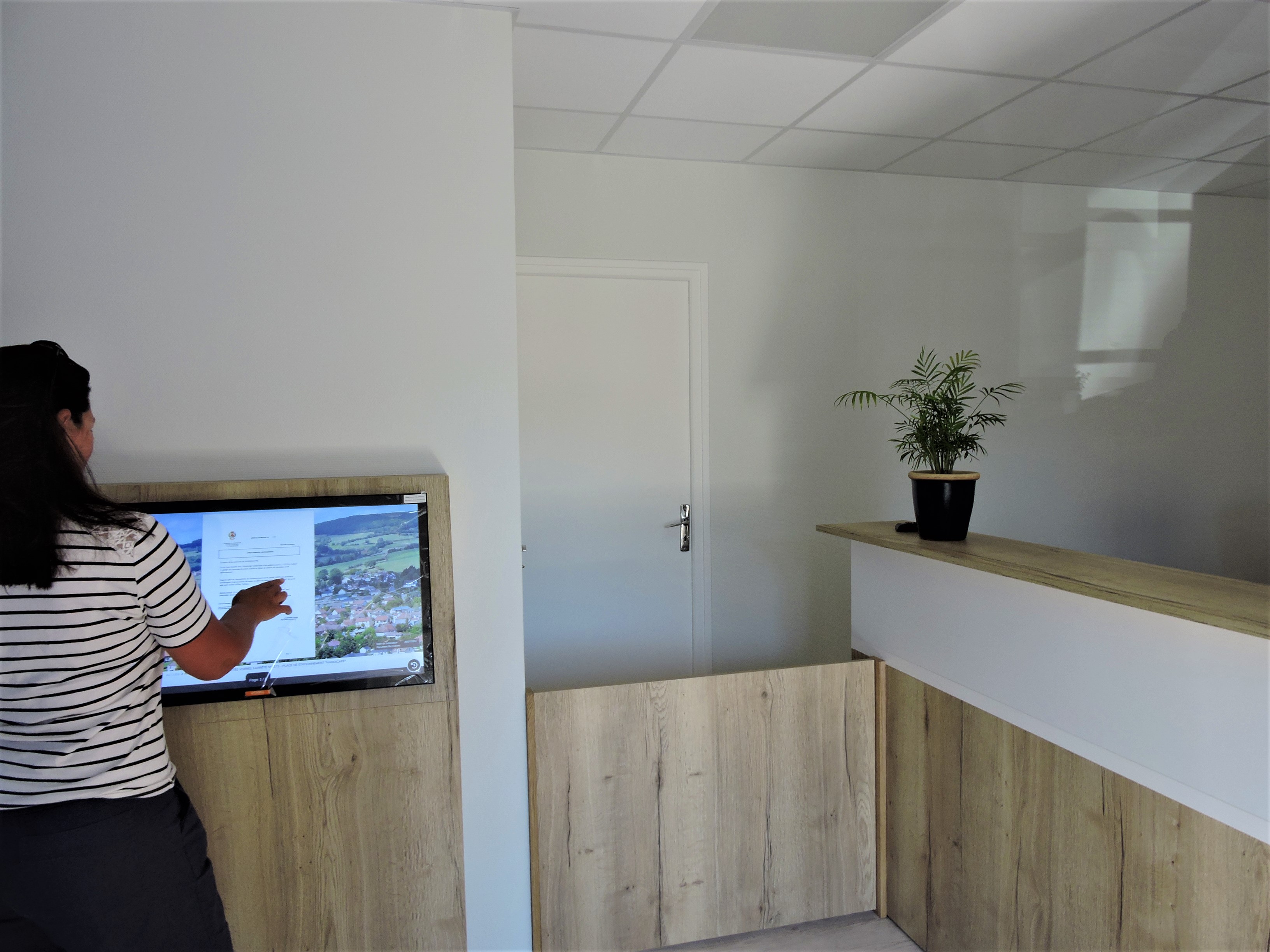 Après 6 semaines de travaux le secrétariat de mairie a été complètement rénové. Durant cette période le secrétariat a été transféré dans la salle du conseil à proximité. L'espace a fait peau neuve avec notamment l'installation d'un nouvel éclairage plus économique et d' une nouvelle banque d'accueil fonctionnelle adaptée aux personnes à mobilité réduite. Dans des locaux plus clairs et plus accueillants l'installation d'une tablette tactile Ipoview permet de consulter l'affichage légale ( permis de construire, arrêtés, documents d'urbanisme, etc...). Elle remplace l'affichage papier trop surchargé par manque de place.