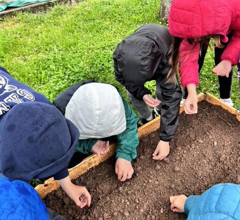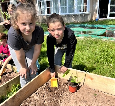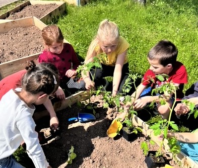 Dans des espaces aménagés en jardin les enfants de l'école élémentaire et maternelle ont réalisé des plantations qu'ils vont entretenir et suivre l'évolution de la pousse. Parmi elles, pommes de terre, courgette, radis, mâche, menthe, ciboulette, thym, tomates cerises vont bénéficier de toute l'attention des écoliers..
