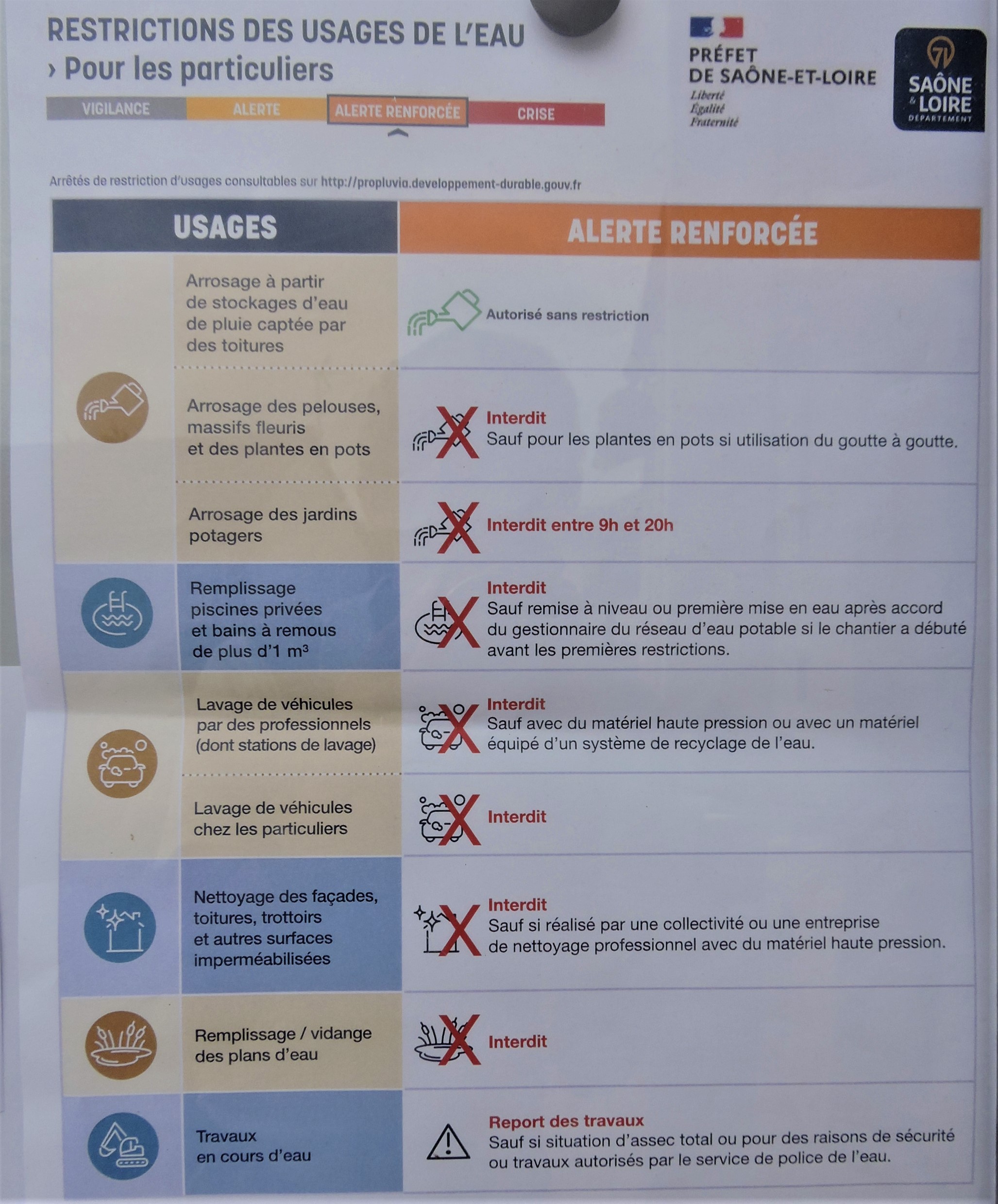 Le dernier arrêté sécheresse du préfet est toujours en vigueur. La commune de Marmagne fait l'objet des restrictions concernant le niveau alerte renforcée.