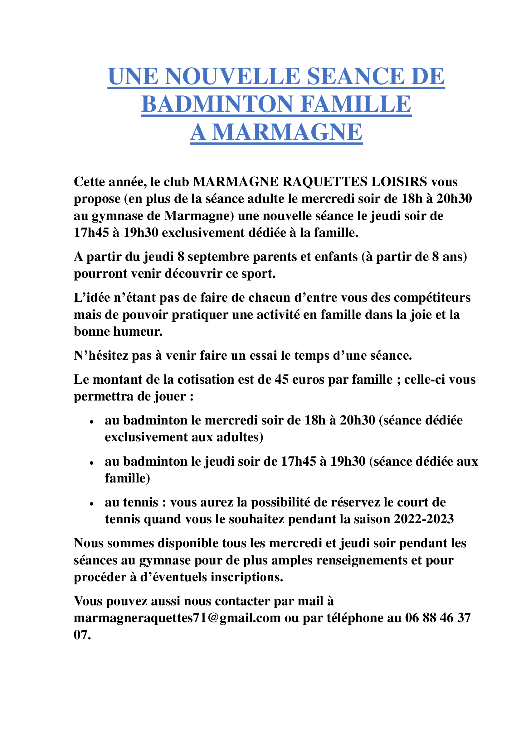 Une nouvelle séance badminton famille à Marmagne raquettes